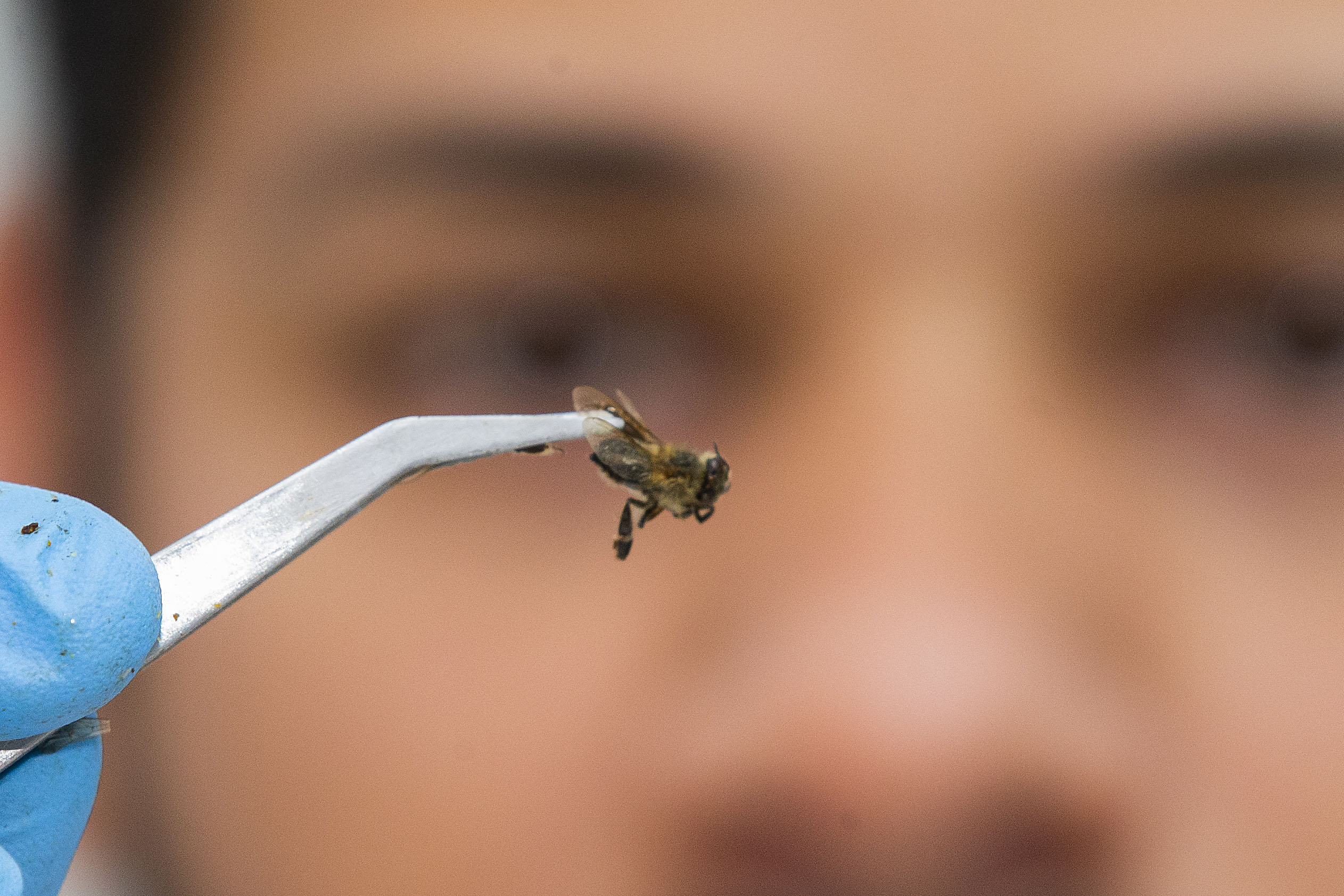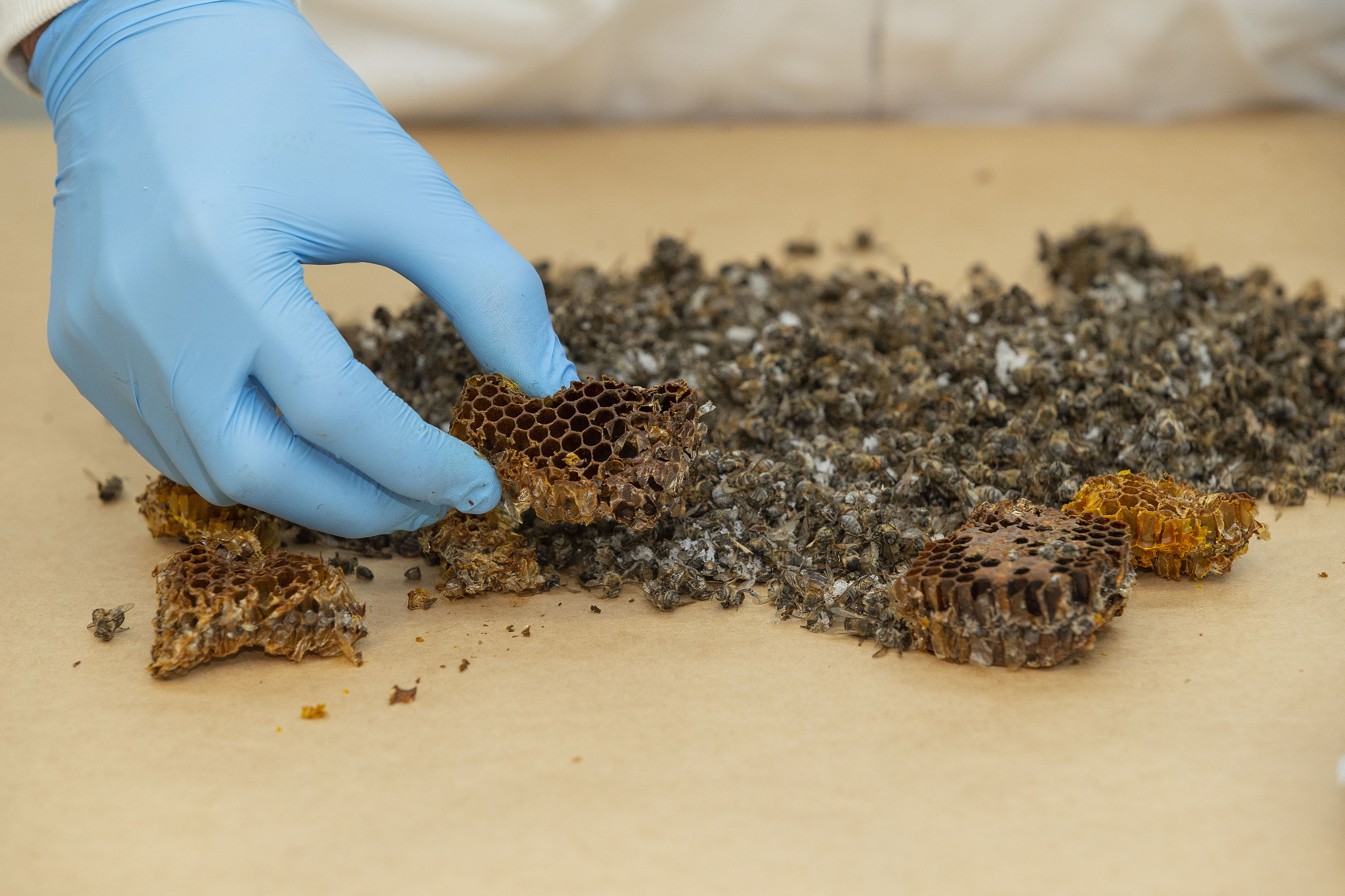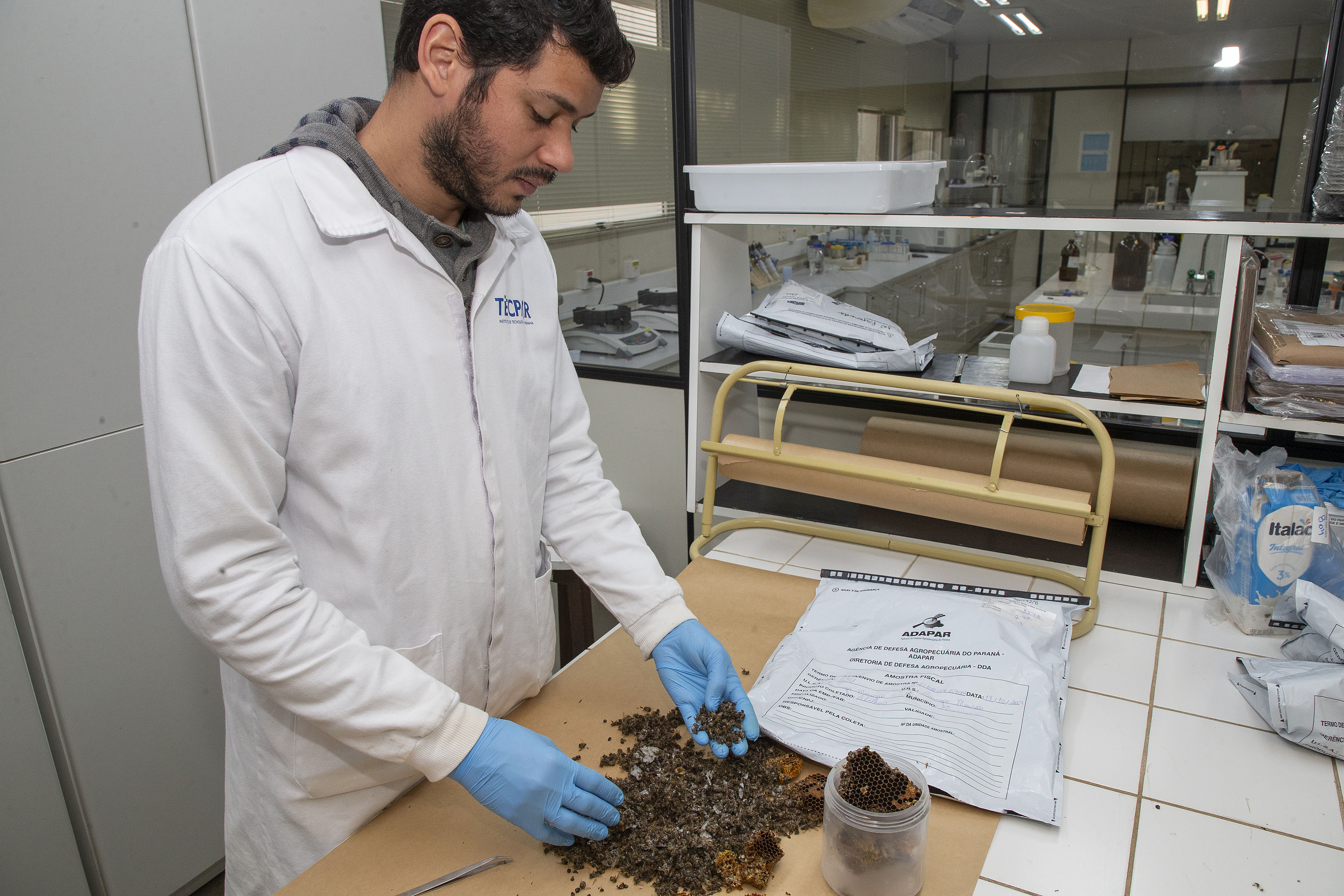 CURITIBA (BRASIL), 27/04/2023; Funcionário do TECPAR analisa abelhas mortas em parceria com a ADAPAR, Paraná, Brasil,. Foto: Hedeson Alves/TECPAR