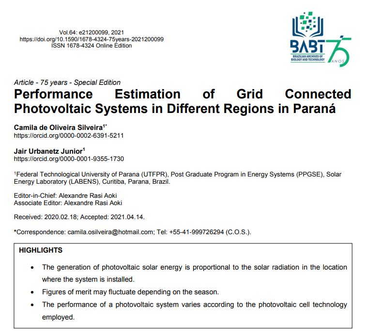 ENERGIAS – Uma das pesquisas publicadas é da engenheira eletricista Camila de Oliveira Silveira, que concluiu seu mestrado no Programa de Pós-Graduação em Sistemas de Energia da UTFPR em 2020. O objetivo da pesquisa publicada no BABT foi estimar o desempenho de sistemas fotovoltaicos instalados em diferentes regiões do Paraná, tomando como base os câmpus da universidade espalhados pelo Estado.