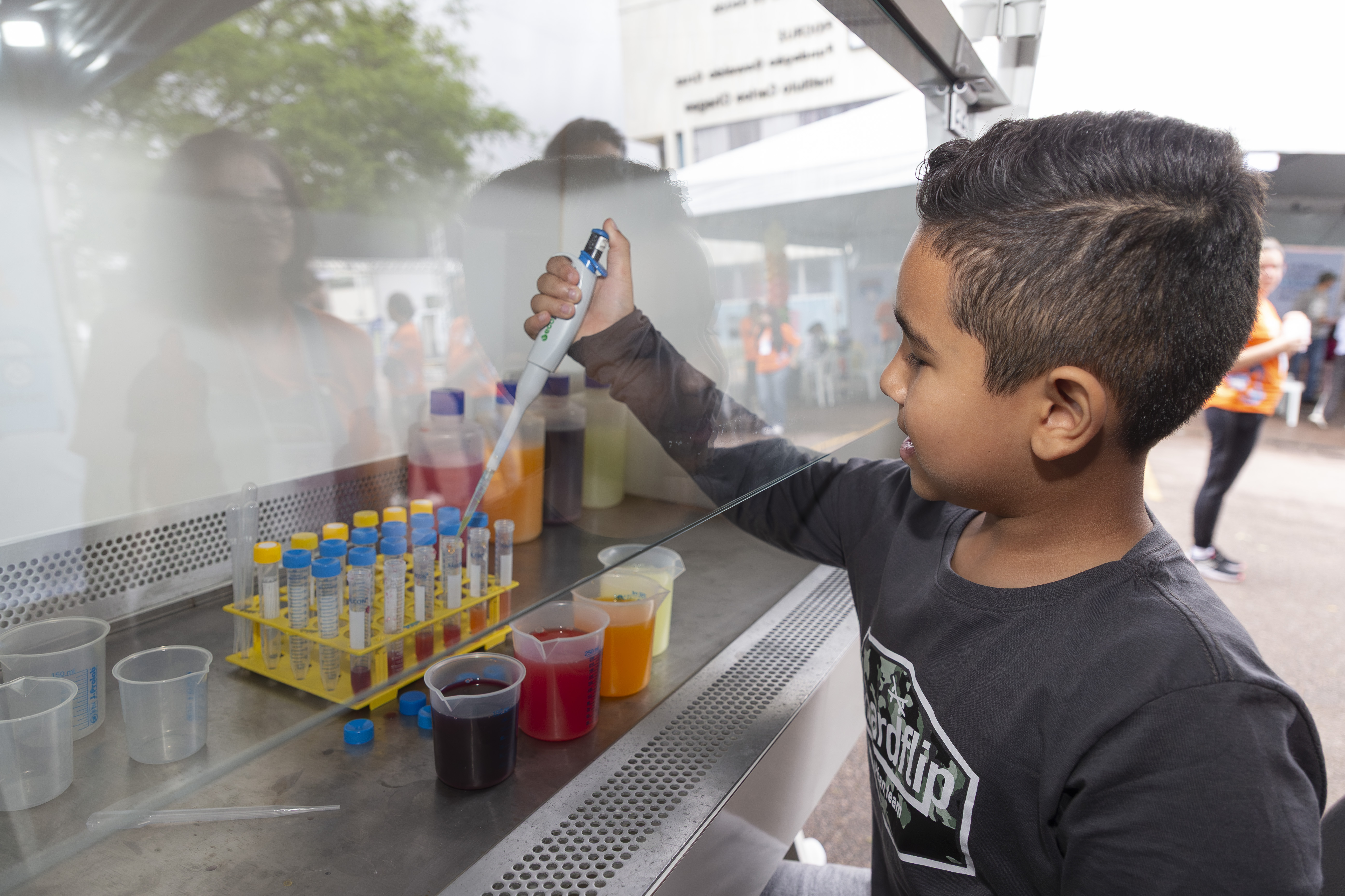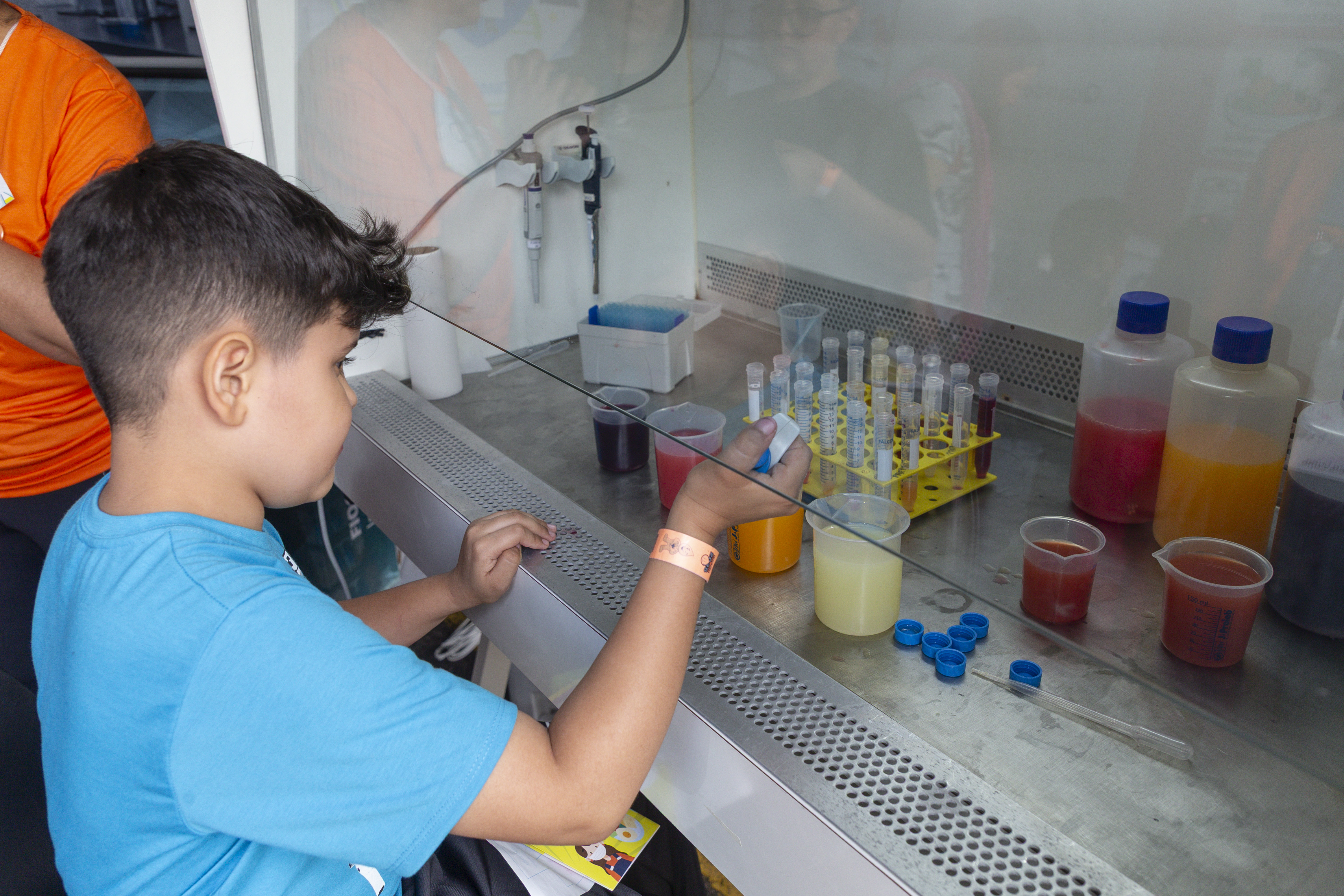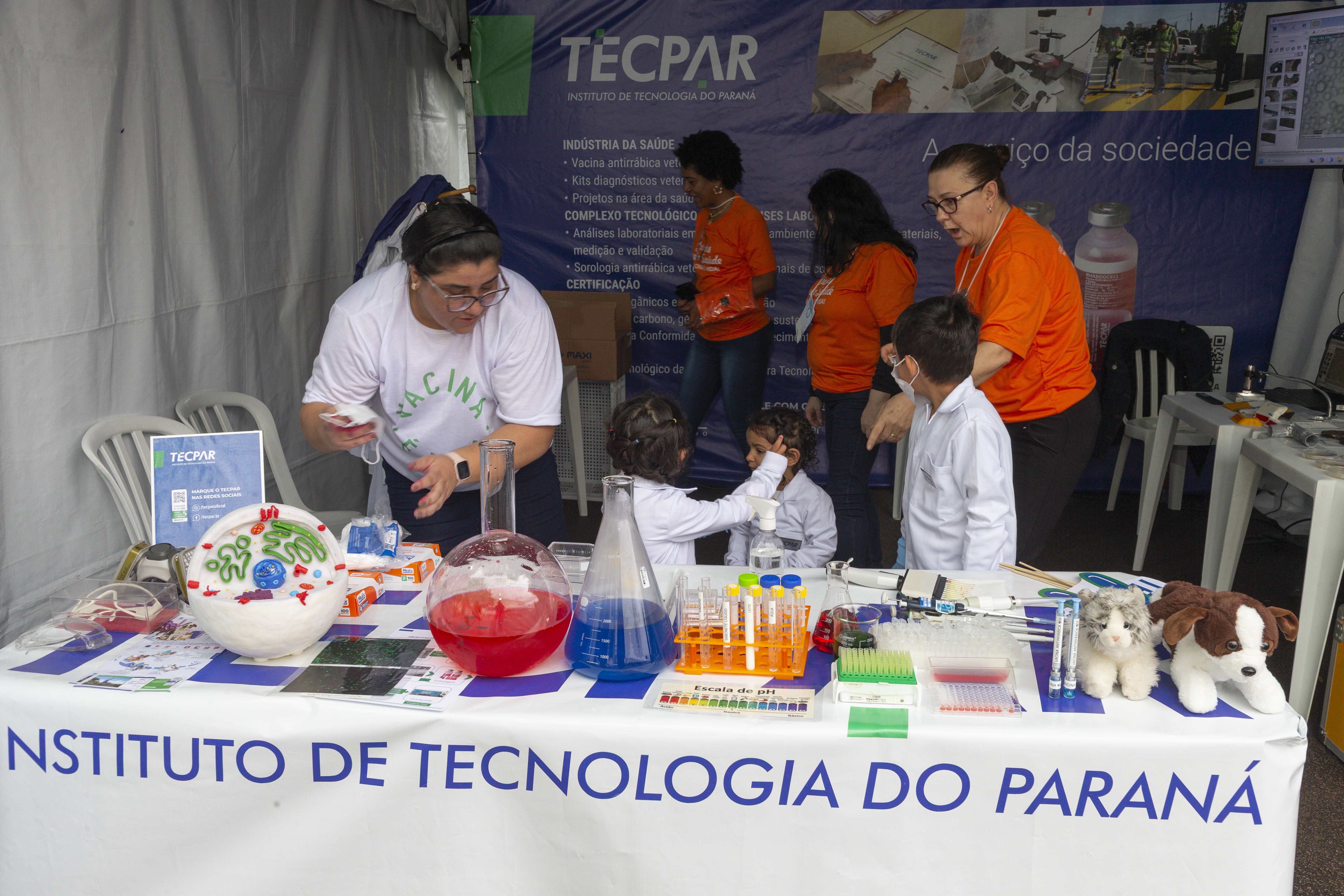 INTERATIVIDADE – Para despertar a curiosidade e o interesse de crianças e adolescentes pela ciência, o estande do Tecpar contou com um laboratório simulado, onde o público assistiu e participou de simulações de análises e ensaios realizados por pesquisadores e colaboradores do Instituto.