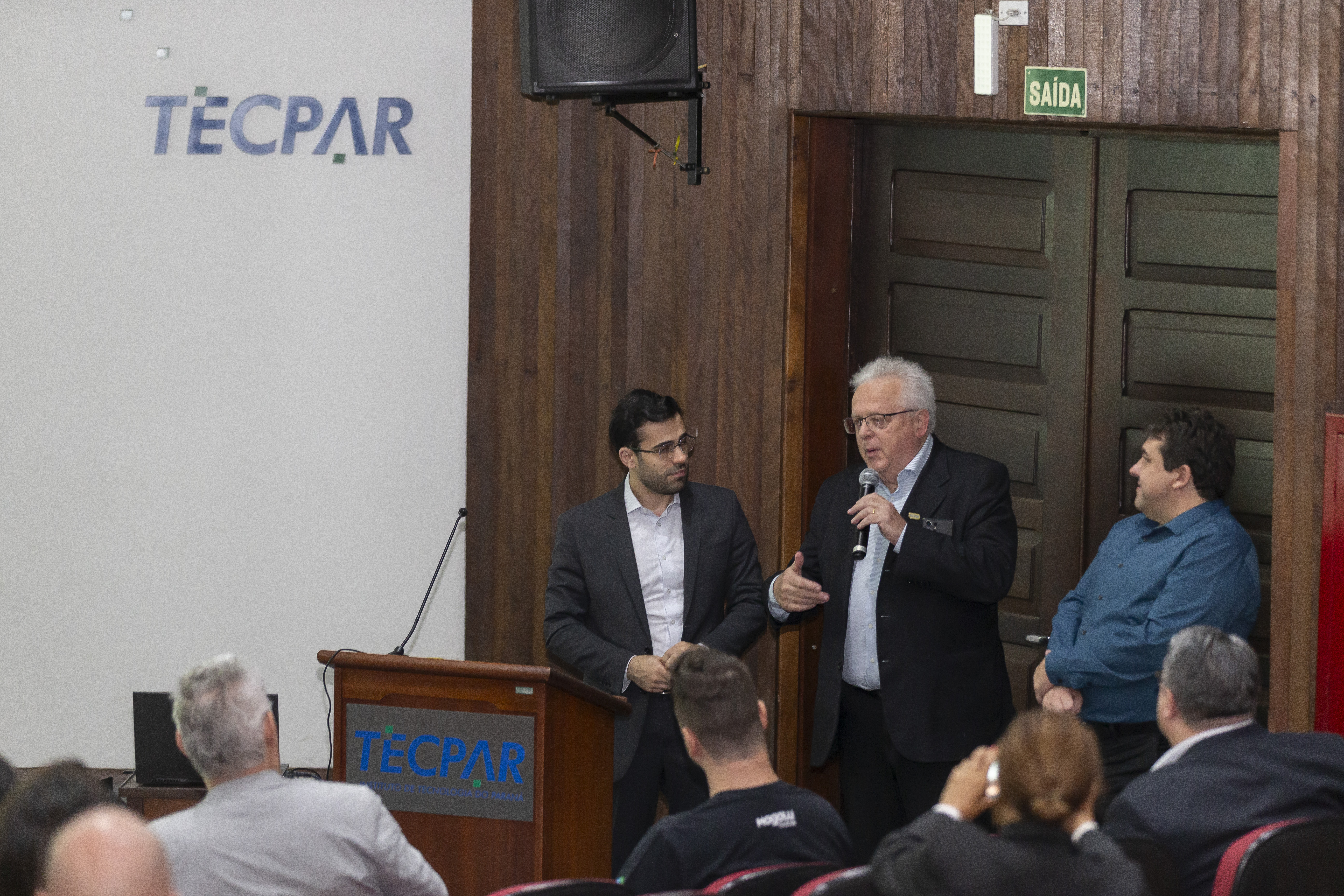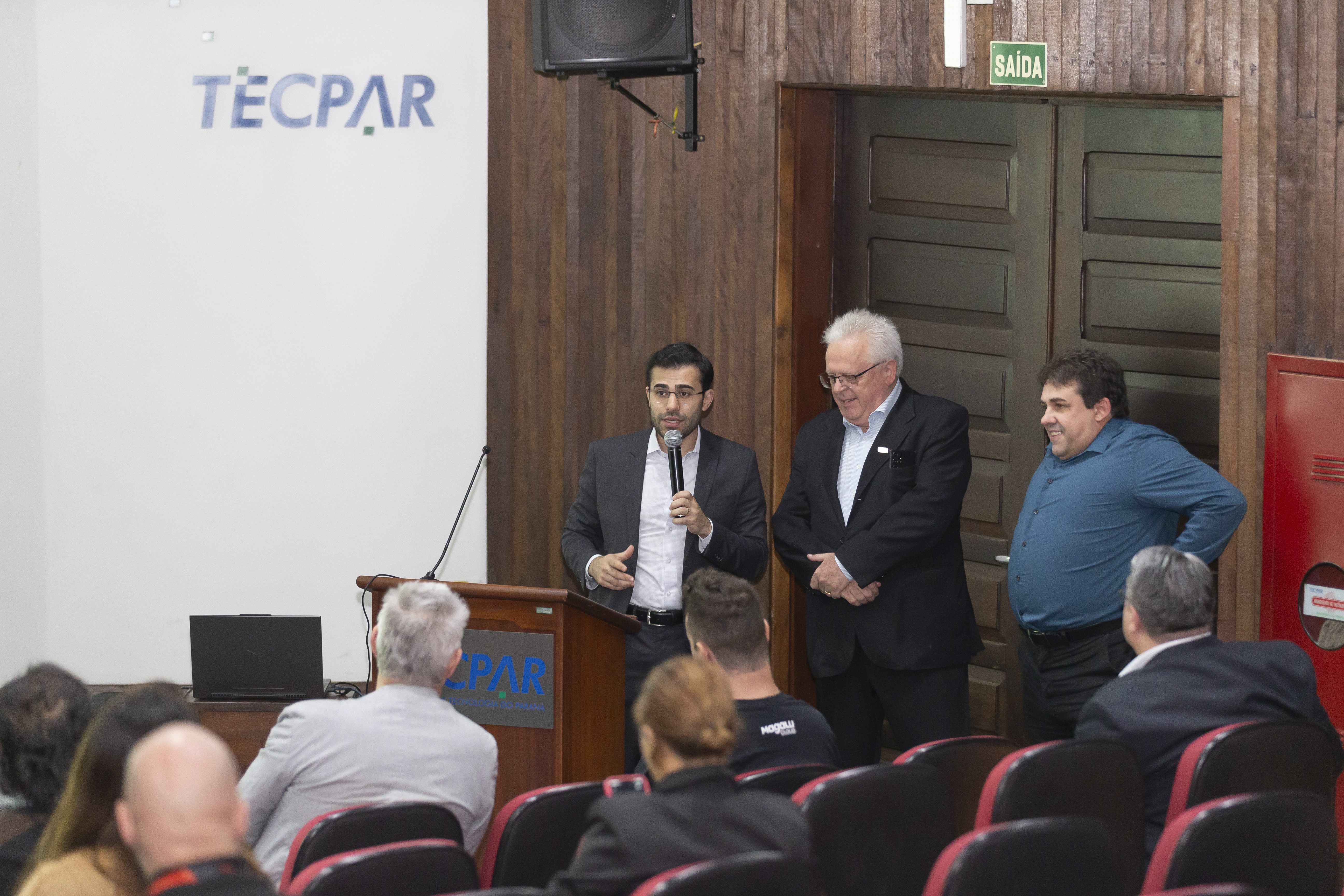 Os participantes foram recebidos pelo diretor-presidente do Tecpar, Eduardo Marafon, e pelo diretor de Novos Negócios e Relações Institucionais do Tecpar, Celso Kloss.